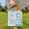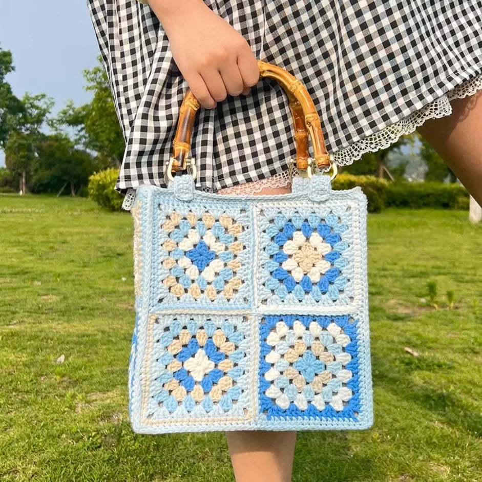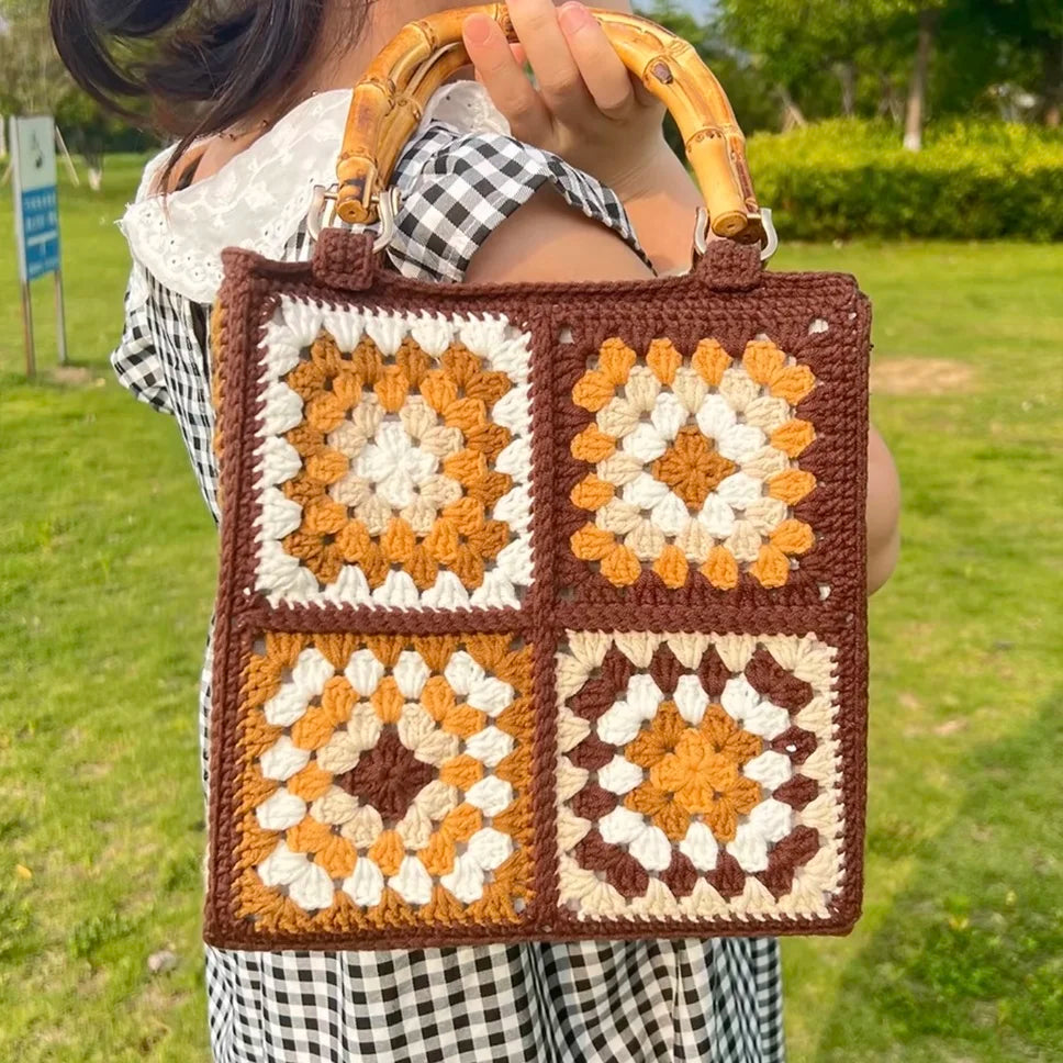 This crocheted bag features the super classic granny square pattern. Each piece is crafted with bright and warm colors, bringing a cheerful and entertaining vibe to both indoor and outdoor settings. The handle design is inspired by Bamboo, very interesting. In addition, it is equipped with very high-quality hardware accessories to make your more exquisite